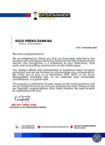 The Ghanaian media landscape is poised to celebrate one of its most influential figures, Kojo Preko Dankwa, as he receives a special honour at the 2025 Elite Entertainment Awards in recognition of his outstanding contributions to the country’s creative and entertainment industry.