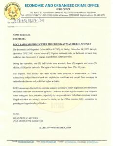 The Economic and Organised Crime Office has broken up a major cyber fraud and human trafficking operation in the Mataheko-Afienya area, leading to the rescue of seven Nigerian nationals who were reportedly trafficked into the country and forced into online fraud.