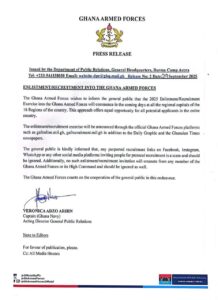 In a press release signed by Captain Veronica Adzo Arhin, Acting Director of Public Relations, the Armed Forces stated that the exercise is designed to provide equal opportunities for all potential applicants nationwide.