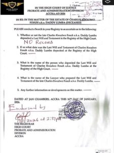 According to court documents, the registry search was initiated to determine whether Daddy Lumba had deposited a will with the High Court. The request also sought details such as the date of deposit, the individual who submitted the document, and the lawyer who prepared it, should such a will exist.