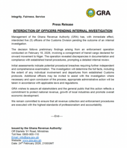 In a press release issued on February 24, 2026, the Authority said the officers had been suspended with immediate effect pending the outcome of an internal investigation.
