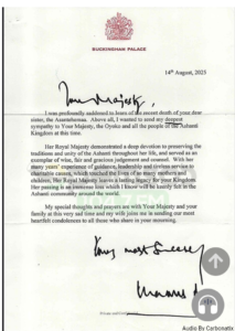 Concluding his message, King Charles expressed his family’s solidarity with Otumfuo and the Asante kingdom. “My special thoughts and prayers are with Your Majesty and your family at this very sad time, and my wife joins me in sending our most heartfelt condolences to all those who share in your mourning,” the statement read.