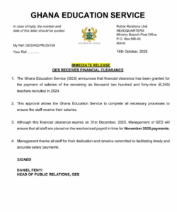 GES assured that the necessary arrangements are being made to ensure the affected teachers are added to the mechanised payroll in time for their November 2025 salary payments. The clearance, however, expires on December 31, 2025.