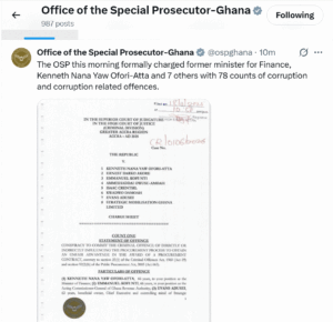 The charges stem from an extensive investigation by the OSP into alleged corruption involving senior officials at the Ministry of Finance and the Ghana Revenue Authority, as well as individuals linked to Strategic Mobilisation Ghana Limited.