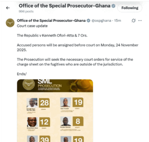The Office of the Special Prosecutor has confirmed that all accused persons in the case Republic v Kenneth Ofori-Atta and 7 Others are expected to appear before the court on Monday, November 24.