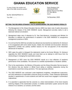 The statement comes as the release of the 2025 WASSCE results sparks nationwide debate over the state of Ghana’s education sector.