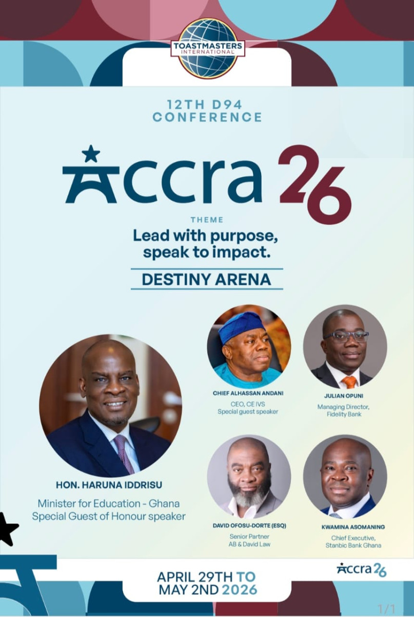Ghana is preparing to host more than 500 delegates from across West Africa and the global diaspora as Accra welcomes the 12th District 94 Conference of Toastmasters International. The four-day event, themed Lead With Purpose, Speak to Impact, is scheduled to run from April 29 to May 2, 2026.